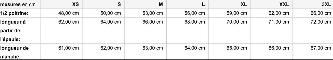 Tailles : XS, S, M, L, XL, XXL, 3XL