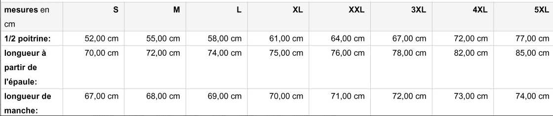 Tailles : S, M, L, XL, 2XL, 3XL, 4XL, 5XL